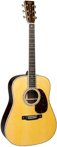 The Martin D-42 is a trusted blend of power and pearl, designed for players who seek bold tone and stunning visual details. Its Dreadnought body size delivers a loud, projective sound with strong bass, clear trebles, and rich overtones, making it perfect for both powerful strumming and intricate picking. Handcrafted with a solid spruce top and solid East Indian rosewood back and sides, the D-42 produces a resonant, balanced voice suited to all playing styles. The gloss genuine mahogany neck, featuring a Golden Era (GE) Modified Low Oval profile, high-performance taper, and 25.4" scale length, ensures smooth playability and precision. Adorned with intricate abalone details, the D-42 features snowflake inlays on the bridge and bound ebony fingerboard, a shimmering rosette, and pearl trim on the top that wraps elegantly around the fingerboard. Complete with antique white binding, an ebony bridge with bone pins, and gold open gear tuners, the D-42 is a guitar you can trust to unleash the artist within.